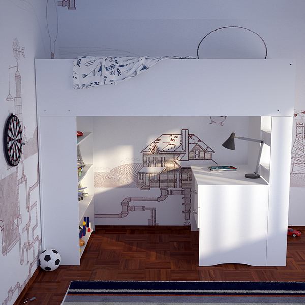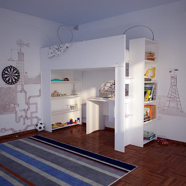 Raised bunk bed design with Bookshelf at the end near the steps and open space underneath with built-in shelves and a 2 drawer students desk